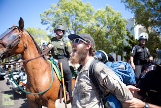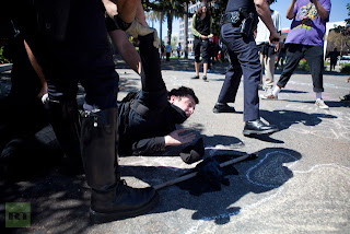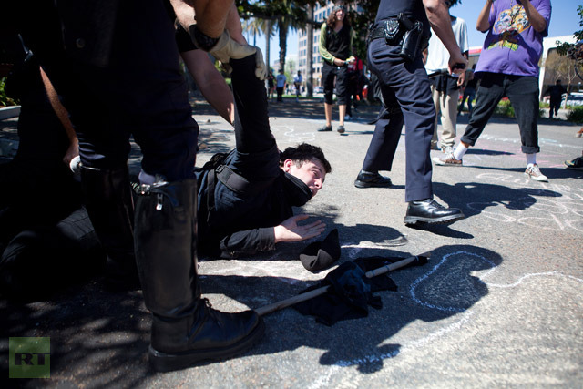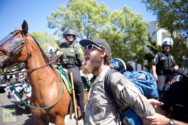 A protester is taken into custody by Orange County Police Officers during a demonstration to show outrage for the several recent officer involved shootings on July 29, 2012 in Anaheim, California. (Jonathan Gibby/Getty Images/AFP)